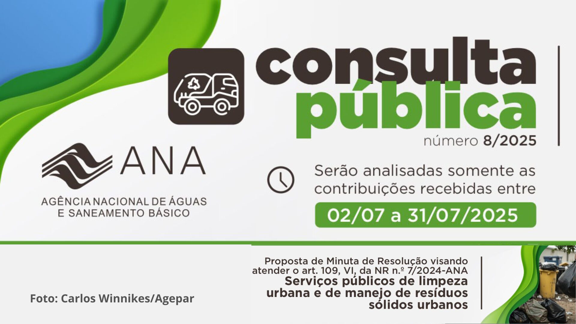 A partir desta quarta-feira, 2 de julho, a Agência Reguladora de Serviços Públicos Delegados do Paraná (Agepar), realizará a Consulta Pública 8/2025. O objetivo é obter contribuições, sugestões e críticas da sociedade a respeito da proposta de Resolução que dispõe sobre as condições gerais para a prestação dos serviços públicos delegados de limpeza urbana e de manejo de resíduos sólidos urbanos que são regulados pela Agência.