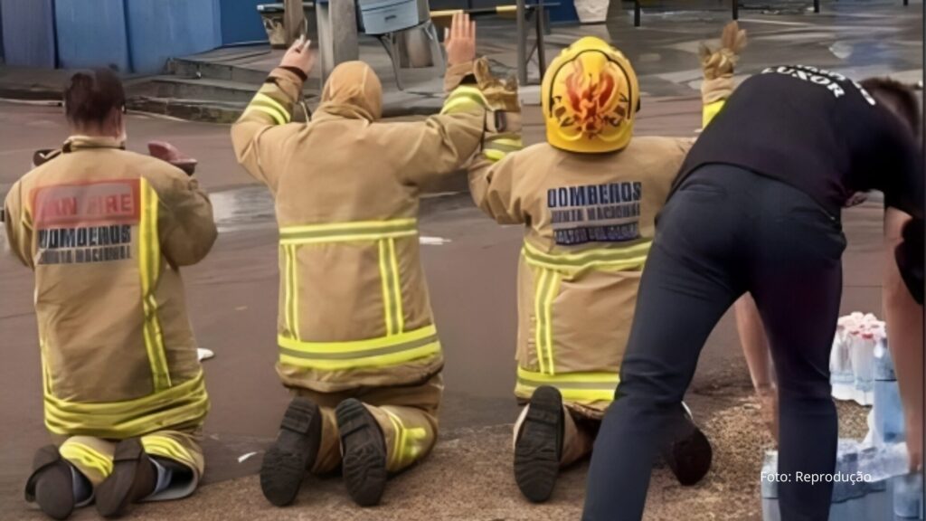 Em meio aos incansáveis trabalhos, eis que a chuva cai: segundo os bombeiros, “ajuda do Todo-Poderoso” (Deus).