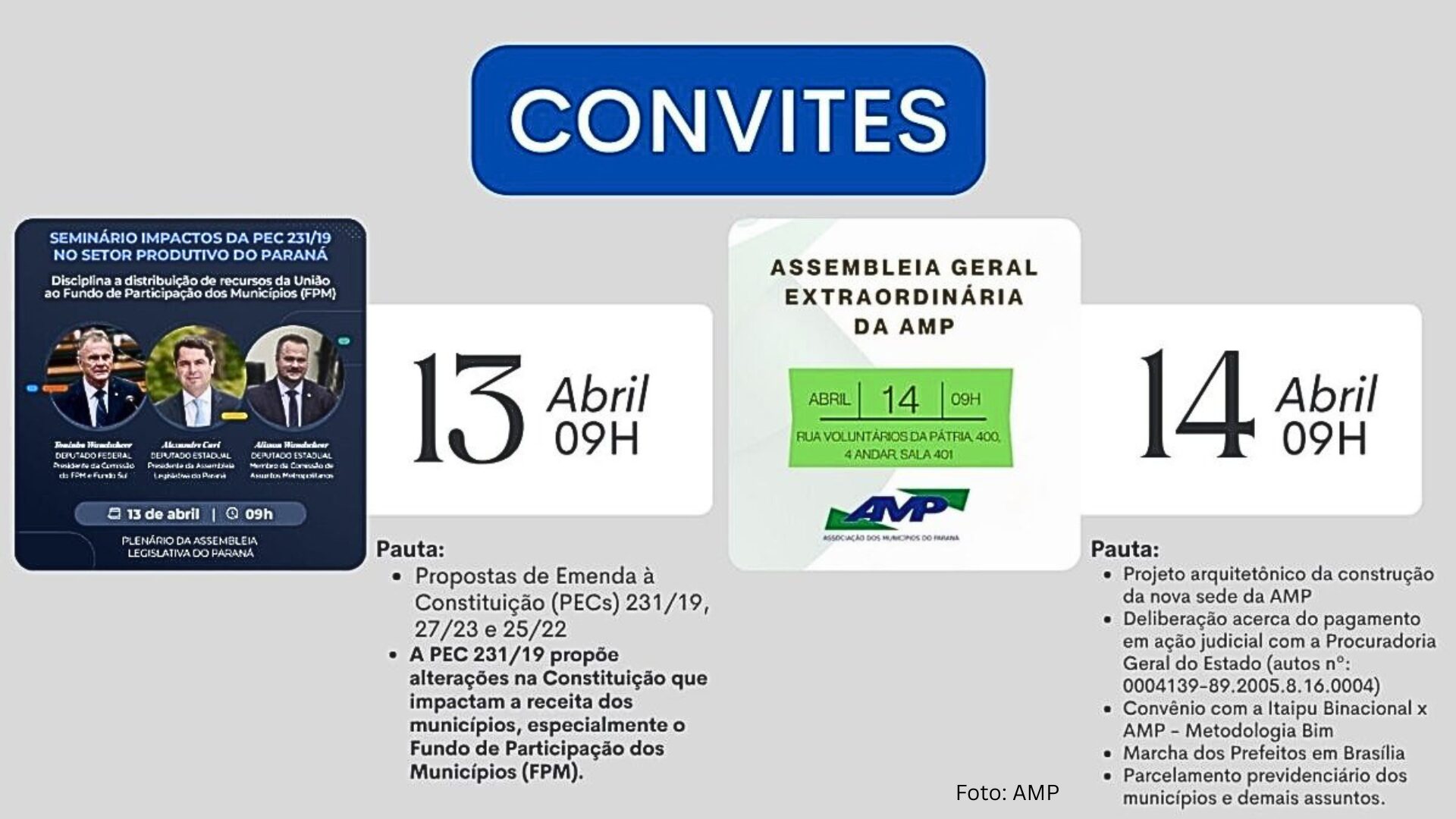 O presidente da AMP (Associação dos Municípios do Paraná) e prefeito de Assis Chateaubriand, Marcel Micheletto, convida os prefeitos e prefeitas a participarem de dois eventos importantes para as prefeituras que serão promovidos nos dias 13 e 14 de abril, ambos em Curitiba.