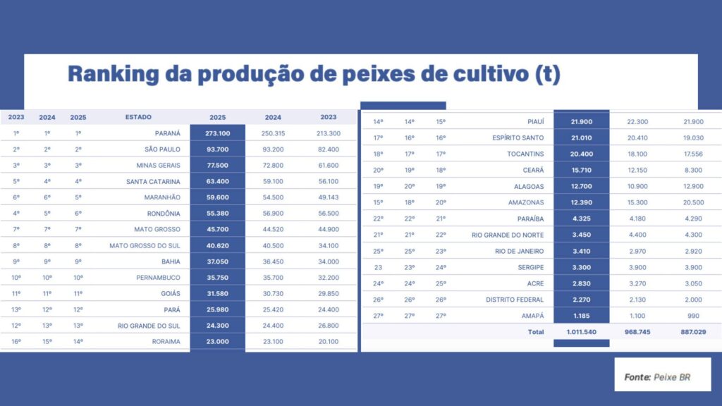 Pela primeira vez o Brasil alcançou a marca de 1 milhão de toneladas produzidas (1.011.540 t). O resultado do cultivo de pescados cresceu 4,41% no Brasil, se comparado ao volume produzido em 2024. Nos últimos 10 anos, a atividade brasileira cresceu 58,6%.