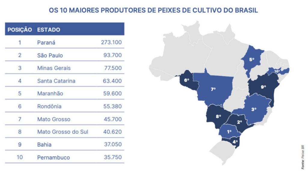 A tilápia é o grande motor da atividade no Paraná e no Brasil. O Estado lidera a produção com 273.100 toneladas. Completando a lista dos cinco maiores produtores nacionais da espécie, aparecem na sequência São Paulo (88.500 t), Minas Gerais (73.500 t), Santa Catarina (52.700 t) e Mato Grosso do Sul (38.700 t). Em todo o Brasil foram 707.495 toneladas, maior resultado da série histórica da última década.