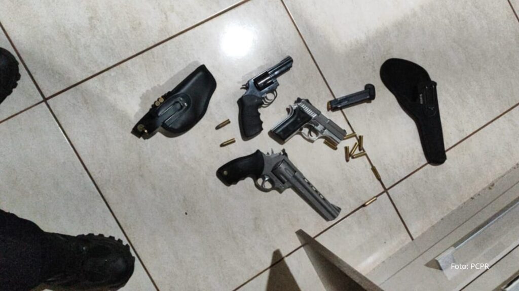 Durante as diligências, as equipes policiais cumpriram seis mandados de busca e apreensão com o apoio de cães de faro da PMPR. Nos endereços, foram localizadas duas pistolas calibre 9mm em posse de um adolescente e mais quatro armas em posse de um adulto, sendo duas de calibres .380 e .357 com numerações suprimidas, um revólver calibre .38 e uma espingarda calibre .22 equipada com luneta.