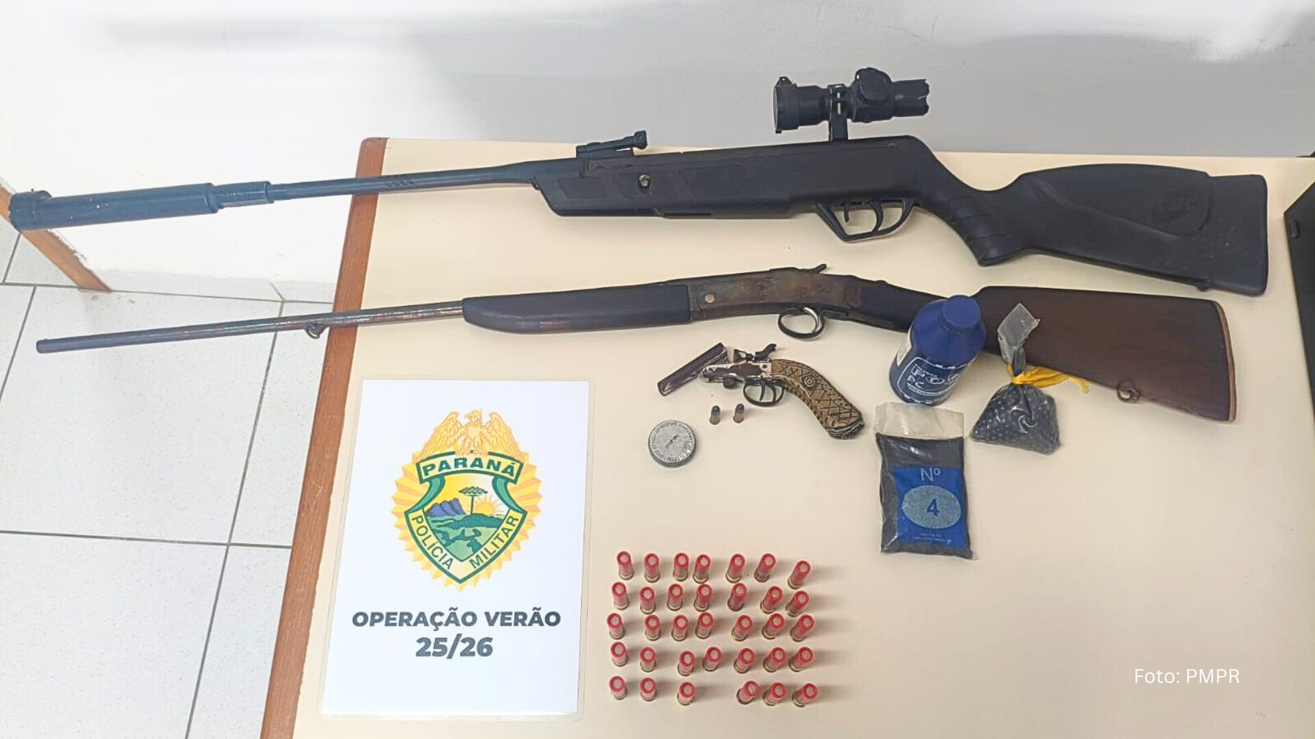 Foram apreendidas uma espingarda calibre .36, uma arma de fogo adaptada calibre .22 e uma garrucha calibre .32, esta última carregada com duas munições intactas, além de munições, pólvora, espoletas e projéteis. Todo o material foi encaminhado à Delegacia da Polícia Civil de Paranaguá para as providências cabíveis.