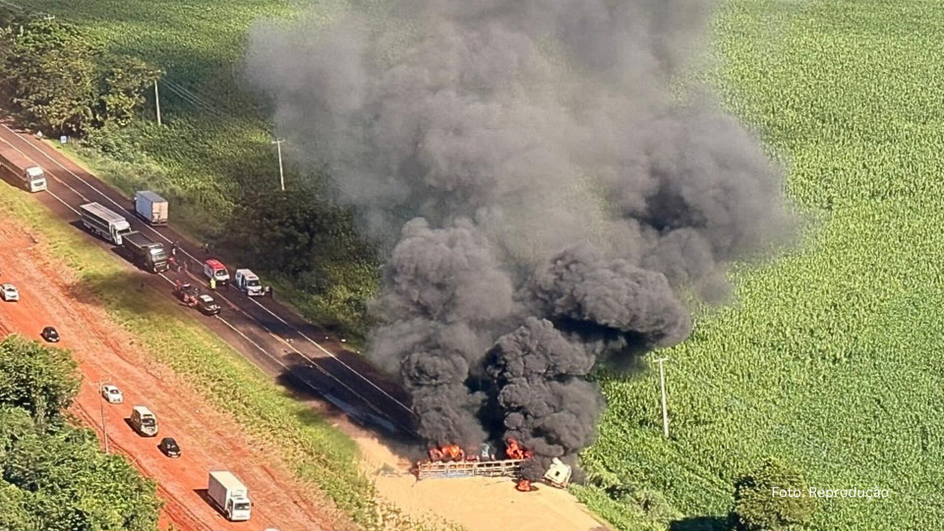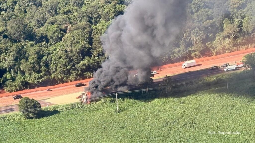 Caminhão pegou fogo, gerando uma imensa nuvem de fumaça vista a quilômetros de distância.